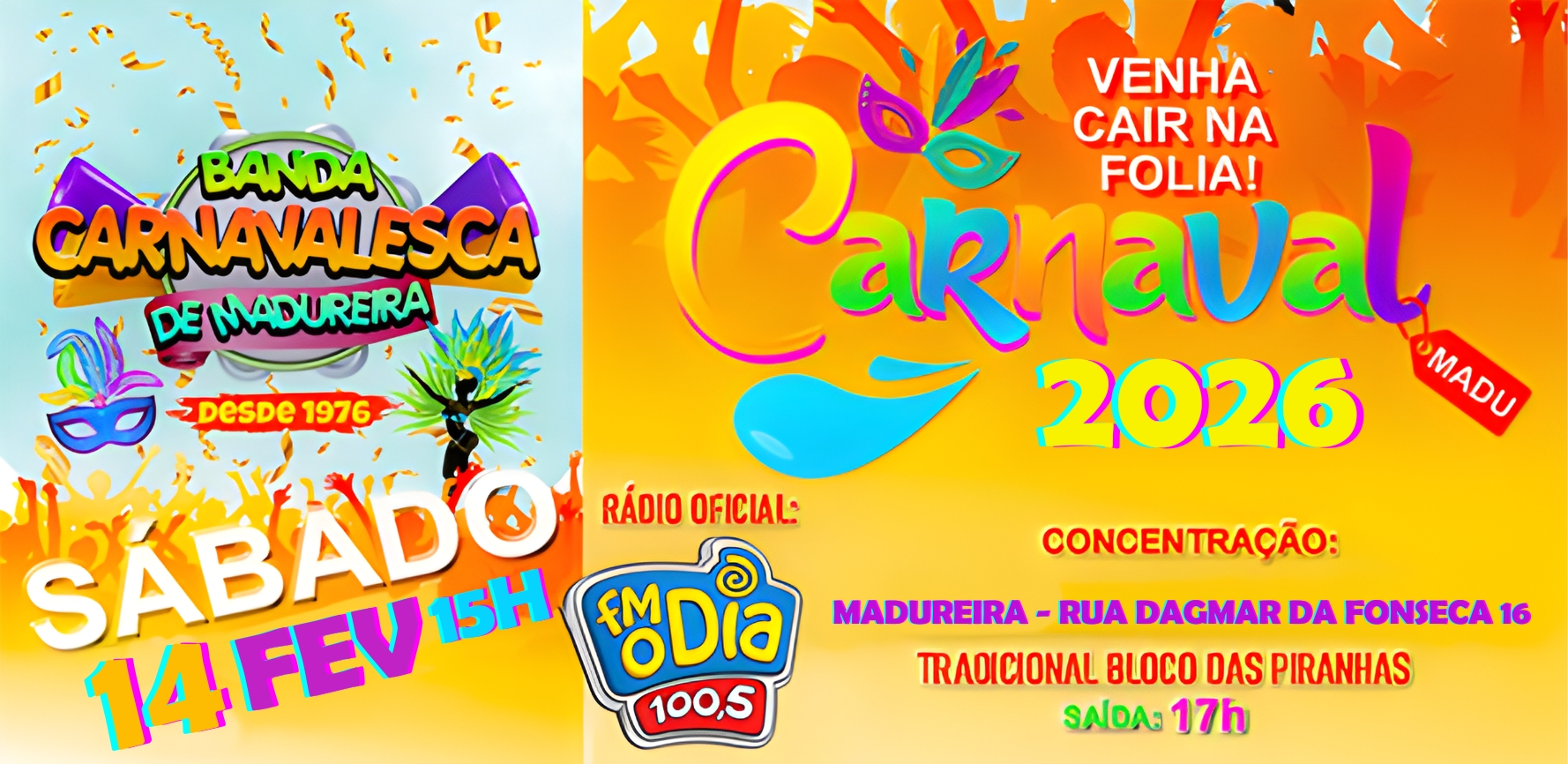 Sábado de Carnaval, 14 de Fevereiro, tem a Banda Carnavalesca de Madureira, a partir das 3 da tarde, na Rua Dagmar da Fonseca, em Madureira. E a FM O Dia vai marcar presença com muitos brindes e animação pra galera. Rádio Oficial: FM O Dia.